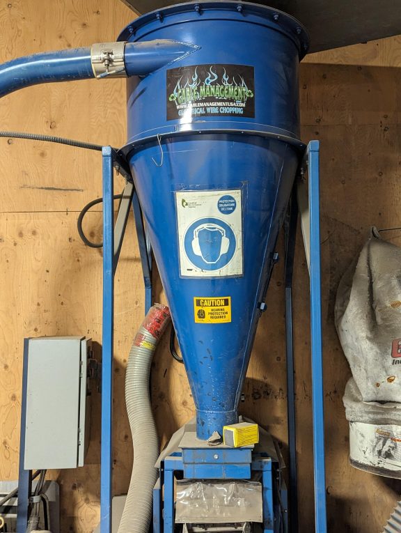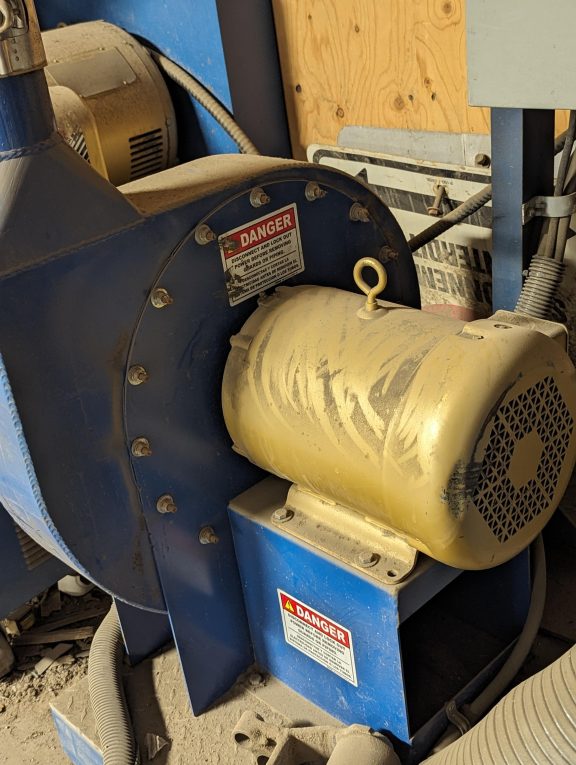 Air Conveyor system with 7.5HP material handling fan, cyclone with clean out door, 4″ steel conduit & flex conduit at joints